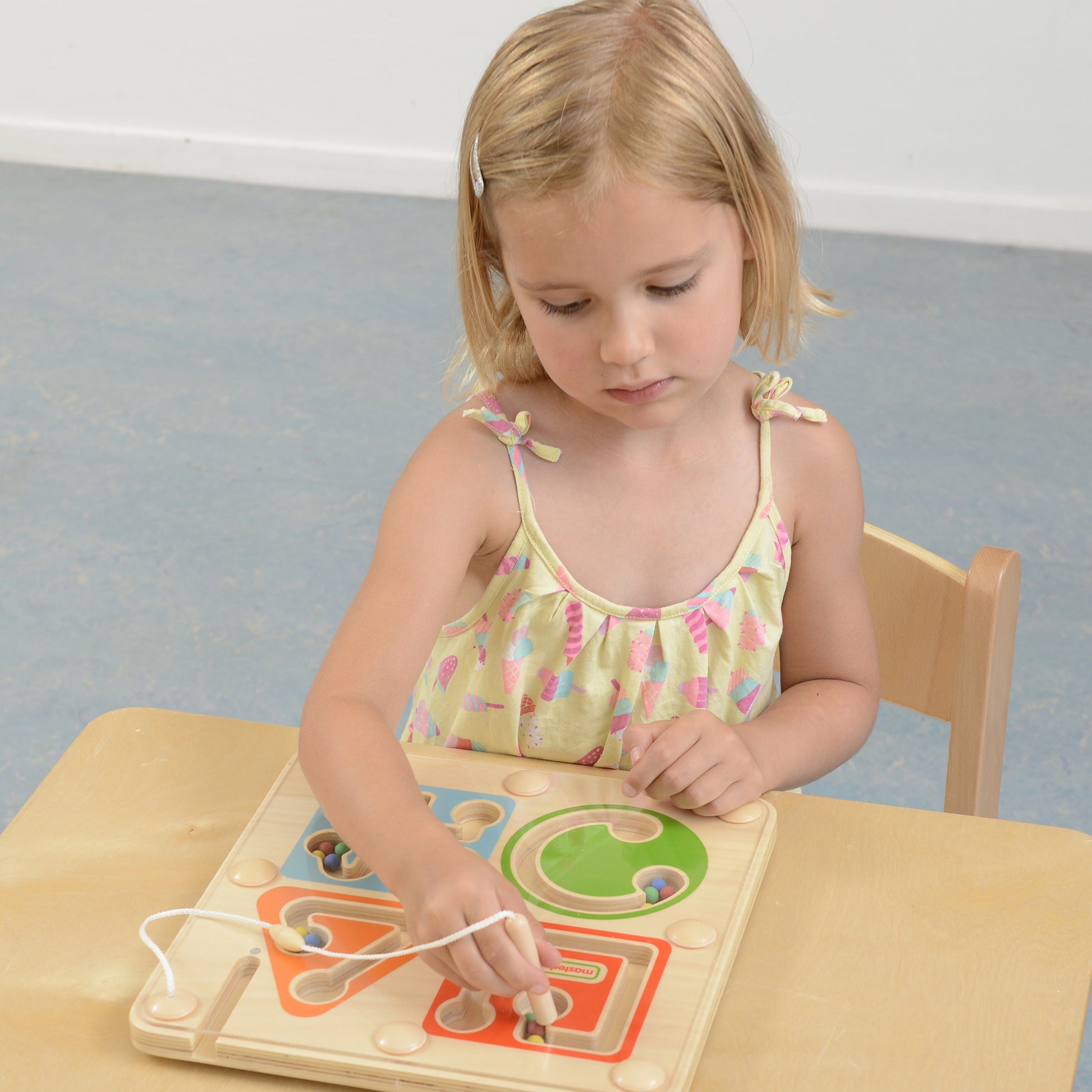 This wooden ;earning board comprises of 4 separate self-contained magnetic mazes, each containing balls which can be moved around using a magnetic pen. Tracks within the shapes provide a progressive set of hand-eye challenges specifically designed to improve key writing skills.