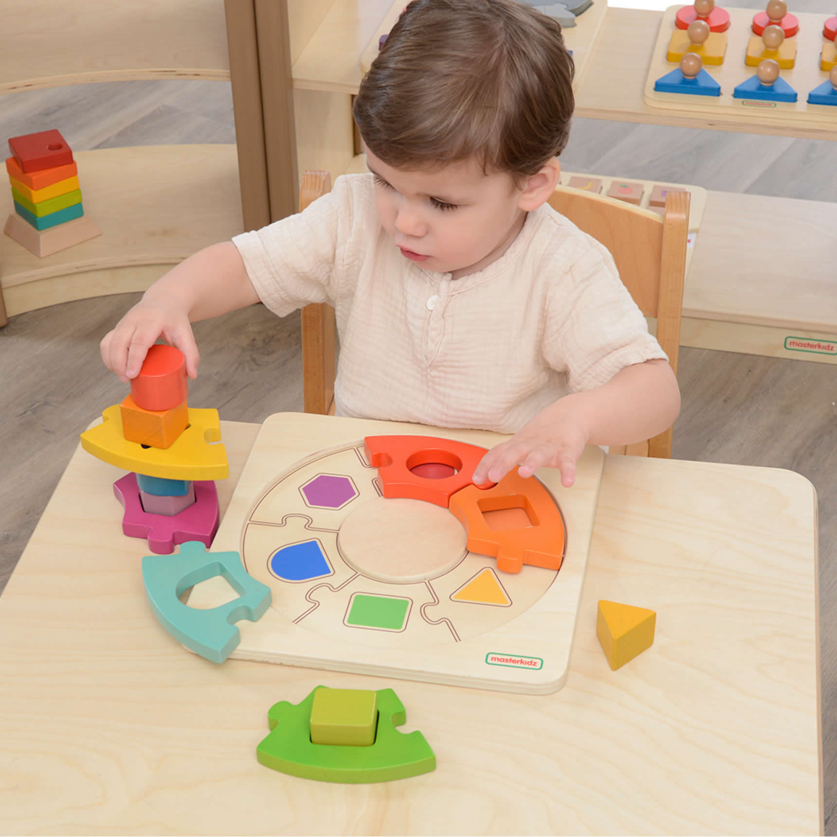 This toy combines coloured jigsaw pieces, with shape and colour matching components. Children will love making the circular donut ring using the chunky beech pieces. They can do this on the desktop in free-play or use the baseboard as a reference. Each coloured jigsaw piece has a differently shaped hole in it. These accept only one of the shaped blocks that accompany the set. The pieces are colour coded to aid the process so matching them up is straightforward, but some of the pieces (arch shaped for example) are not symmetrical so they will need to be orientated to the hole in order for the piece to fit perfectly. Starting with colour identification, matching shapes, naming shapes, fitting them to the correct jigsaw pieces and completing the puzzle on the baseboard in the right order, all adds to the toy providing various levels of progression from easy to more challenging.