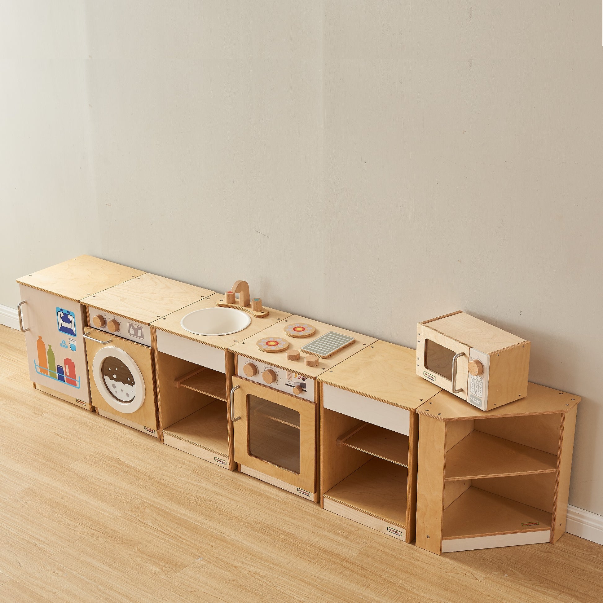 Introducing our Wooden Play Kitchen Set, the perfect addition to any playroom or classroom where organizing is made fun and accessible for students. This set includes a two-tier corner cabinet, a two-shelf kitchen cupboard, a realistic sink unit, a commercial-grade play fridge, a compact microwave, and a cooker.
