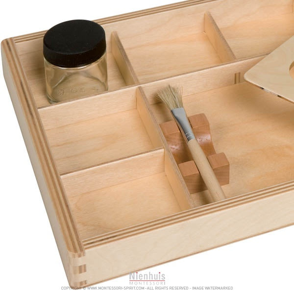 An all-inclusive set for gluing and pasting exercises in the classroom. Includes: a wooden box with six compartments, a glue/paste brush and a glass jar with lid. The lid of the box has a cutout hole that holds the jar upright to avoid spilling the contents.