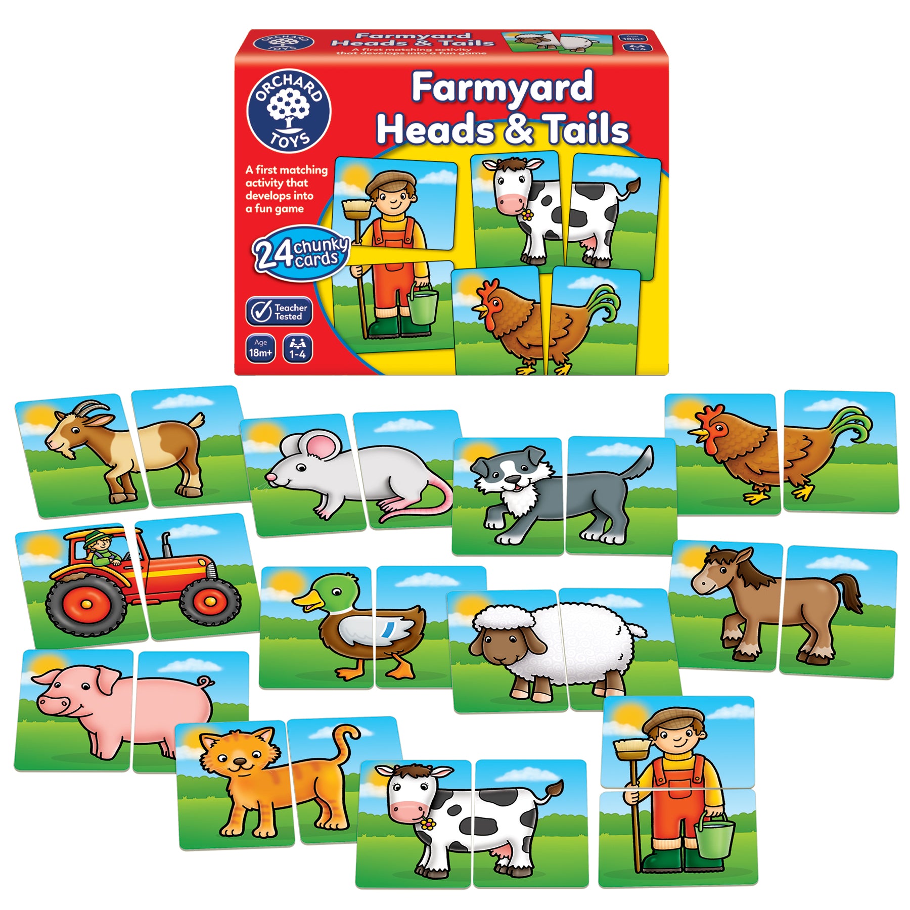 Featuring twelve friendly farm characters and objects to match, Farmyard Heads & Tails encourages observational and memory skills whilst introducing very young children to the concept of turn-taking! Young children will love the bold and colourful illustrations, and the large, chunky cards are ideal for little hands.