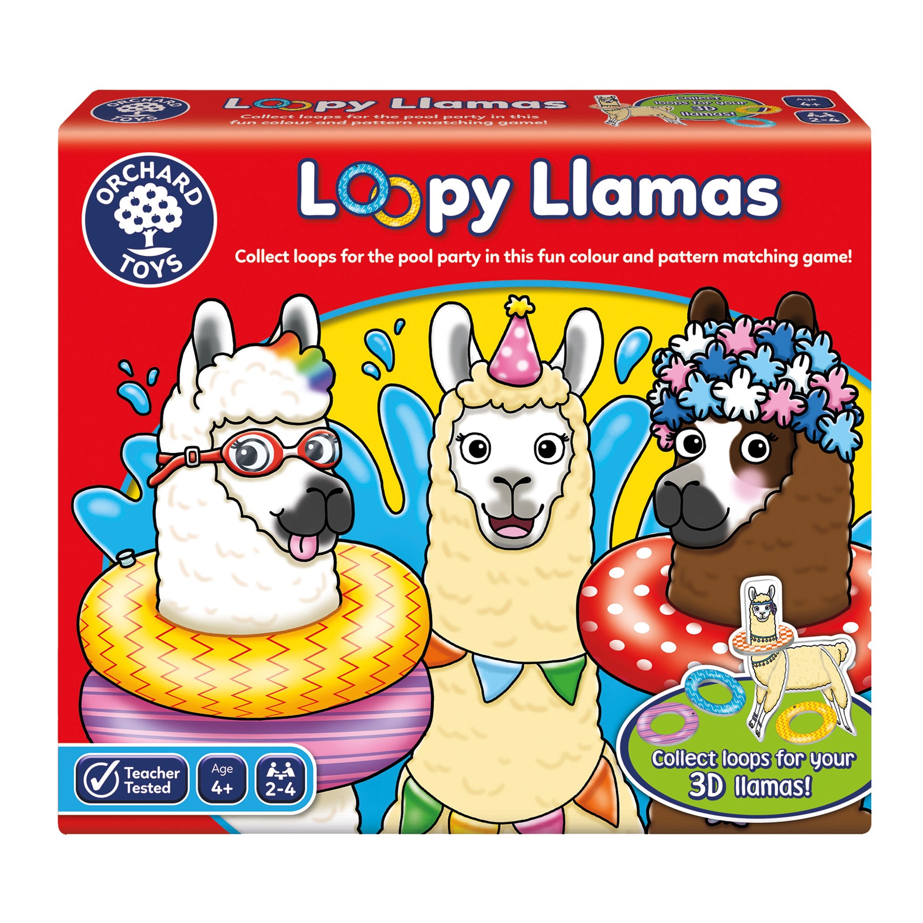 Players take turns moving around the swimming pool playing board collecting one of each of the coloured rings to stack on their 3D llama. Then race to be the first to get your llama to dive into the swimming pool to win the fame! Children will be laughing until the llamas come home in this fun pattern and colour recognition game.