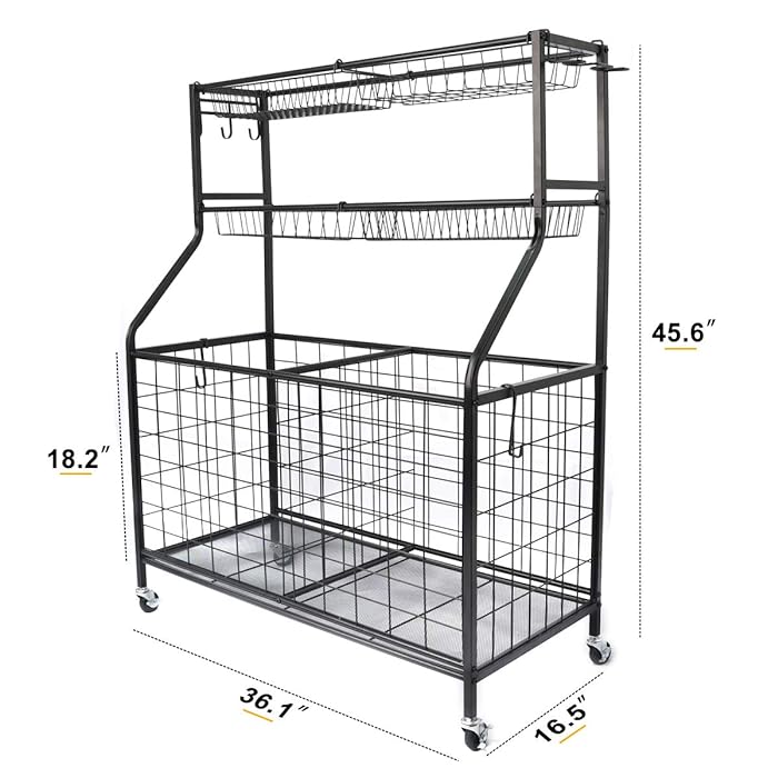 - ⚾MANY OCCASIONS: ⚾The Rolling Sports Ball Basket features in 4 heavy-duty smooth rolling wheels, Indoor & Outdoor Design, which is easy to move the organizer anywhere and fits in a specific position.It is ideal for the garage, home, Storage room, playroom, gym, playgroup and schools. DIMENSIONS: Overall product: 36.1" L x 16.54" W x 46.5" H, each basket: 17.7" L x 9.45" W, each storage bin:17.7" L x 15.7" W x 17.7" H