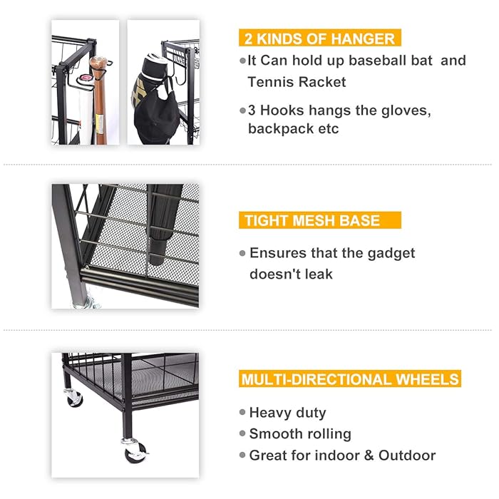 - 🏈Special design sports storage system:🏈 Bats hanging hook can hold baseball and softball bats, tennis, badminton and hockey sticks; 3 hooks easily hange items such as bags, gloves, ball caps, jerseys and all your other sportswear; metal wire basket can stores baseball and softball bats, tennis, badminton, and pickle ball rackets, as well as lacrosse and hockey sticks.