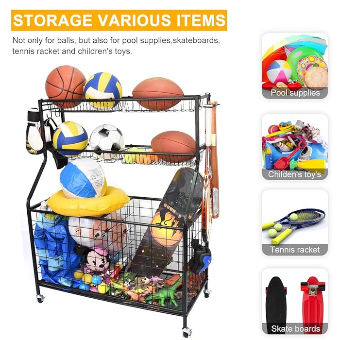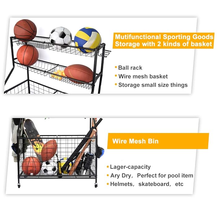 - 🏀ORGANIZE ALL YOUR SPORTS GEAR: 🏀Sports Equipment Organizer with 2 storage bin and 4 wire mesh basket. The large capatity storage bin can holds basketballs, footballs, soccer balls, volleyball, helmets, and even athletic shoes. Organize all your indoor & outdoor sports goods on one basket for truly space saving and providing easy access