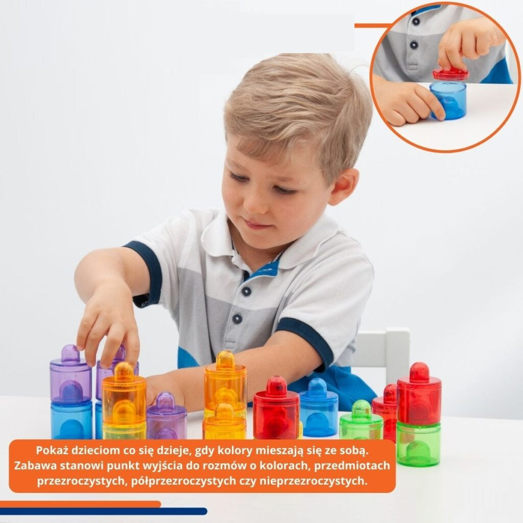 彩虹透光顏色罐套裝包含十八個小型可堆疊的罐子,具有六種不同的透光顏色。每個罐子都有蓋子,非常適合用於填充材料進行探索性遊戲、顏色混合和匹配以及堆疊活動。這有助於發展孩子的邏輯思維能力和改善手眼協調。