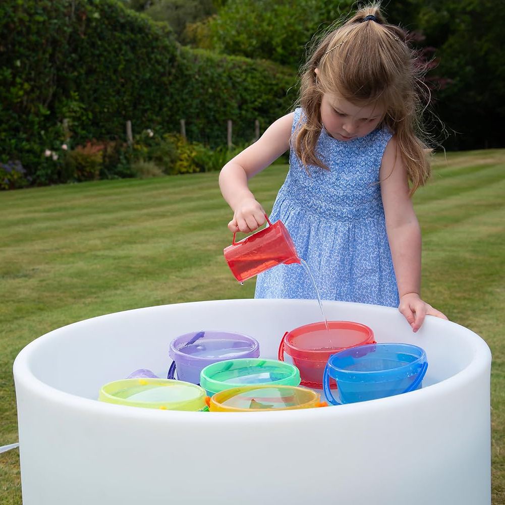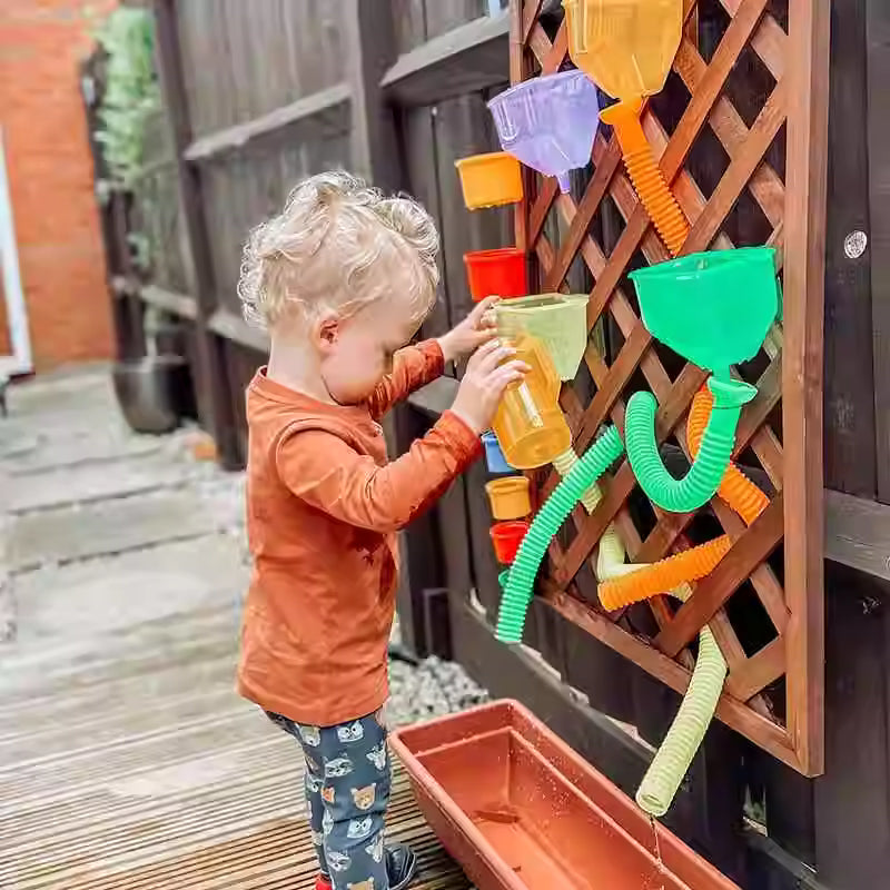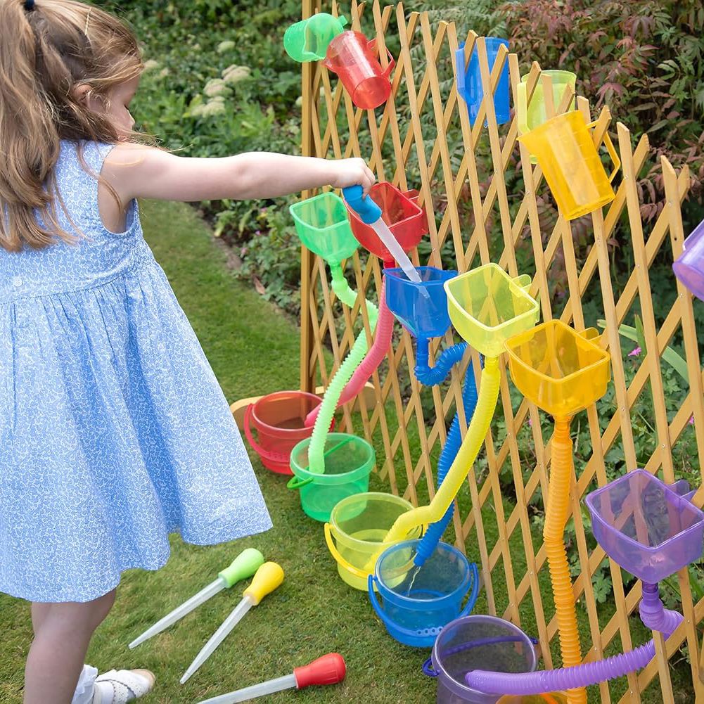Rainbow Translucent Water Wall Set will allow your child to explore while learning. Set up the flexi tubes to guide water from one coloured funnel to the buckets. It’s the ideal way to encourage sensory exploration, and STEM learning in a fun, interactive environment. Whether your child is pouring, splashing, or experimenting with the flowing water.