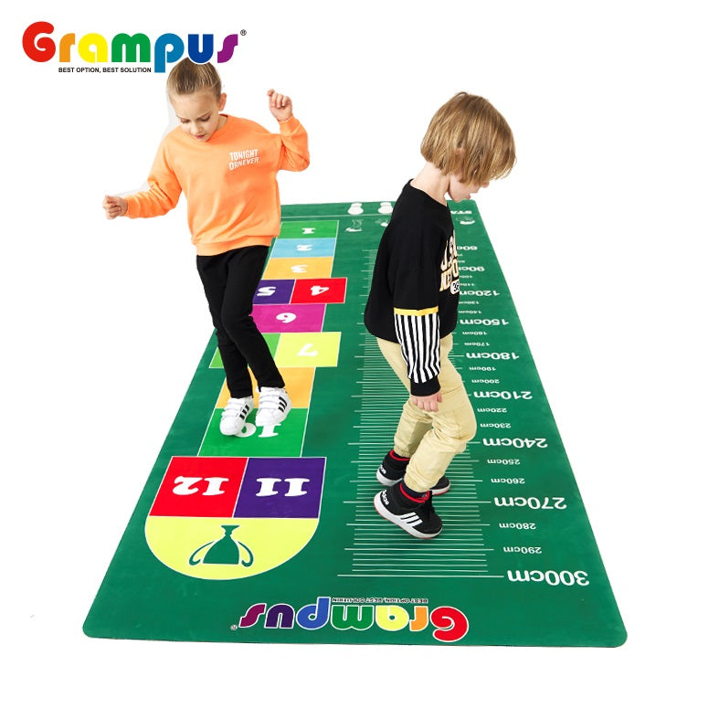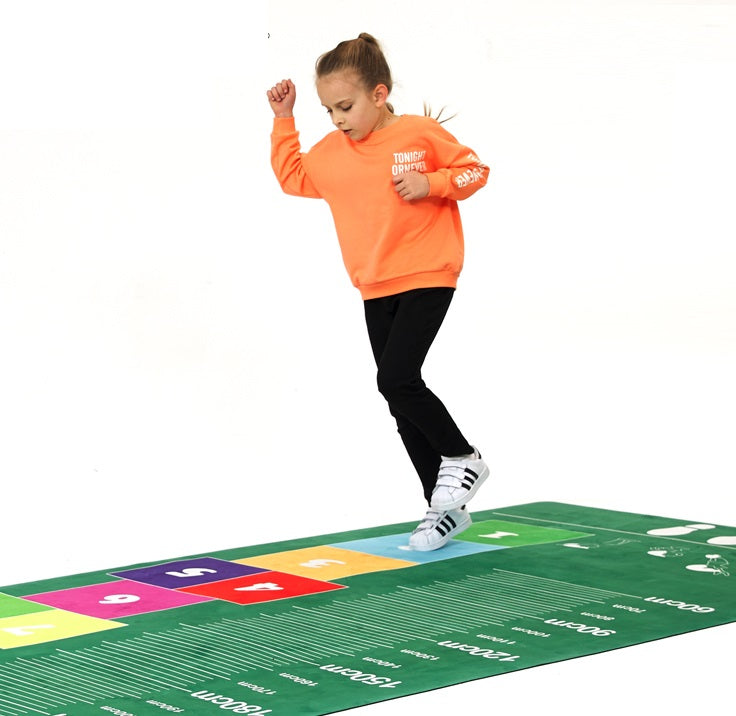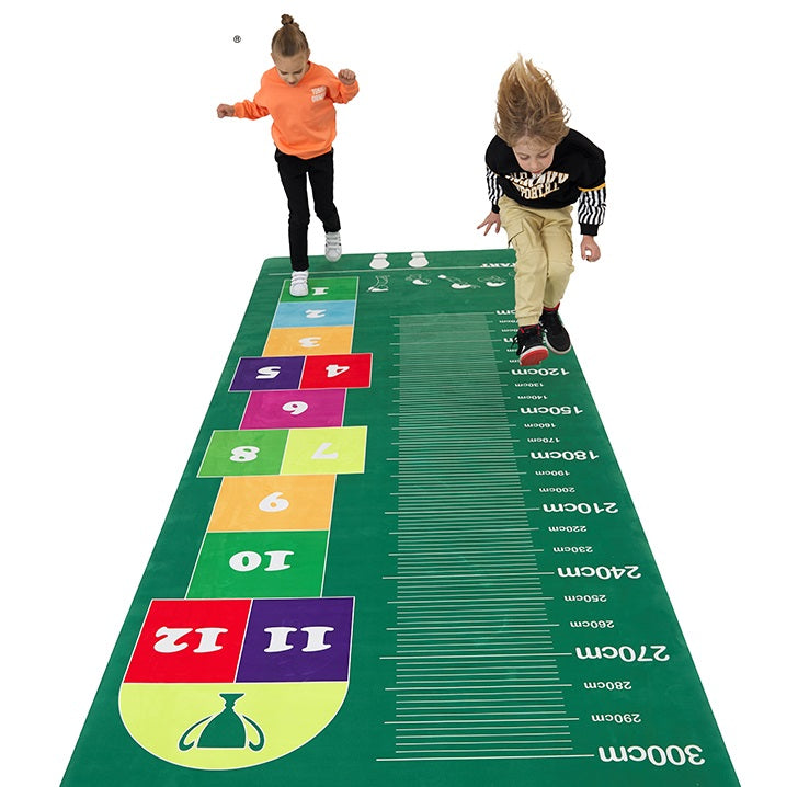 Jumping Mat 2 in 1 serves a dual purpose. It can be used for long jump testing as well as for playing the game of "the floor is lava." The unit of measurement for the long jump is centimeters. The surface is made of imitation deer skin material, which is soft, elastic, and has a non-slip design. It is comfortable, safe, and easy to clean. The reverse side is made of 3mm thick non-slip rubber, ensuring that it does not slide on any type of flooring and ensuring the safety of children. It can assist teachers in teaching and measuring students' jumping skills. Additionally, it can be used as a yoga mat for other exercises. It is suitable for individuals of all age groups.