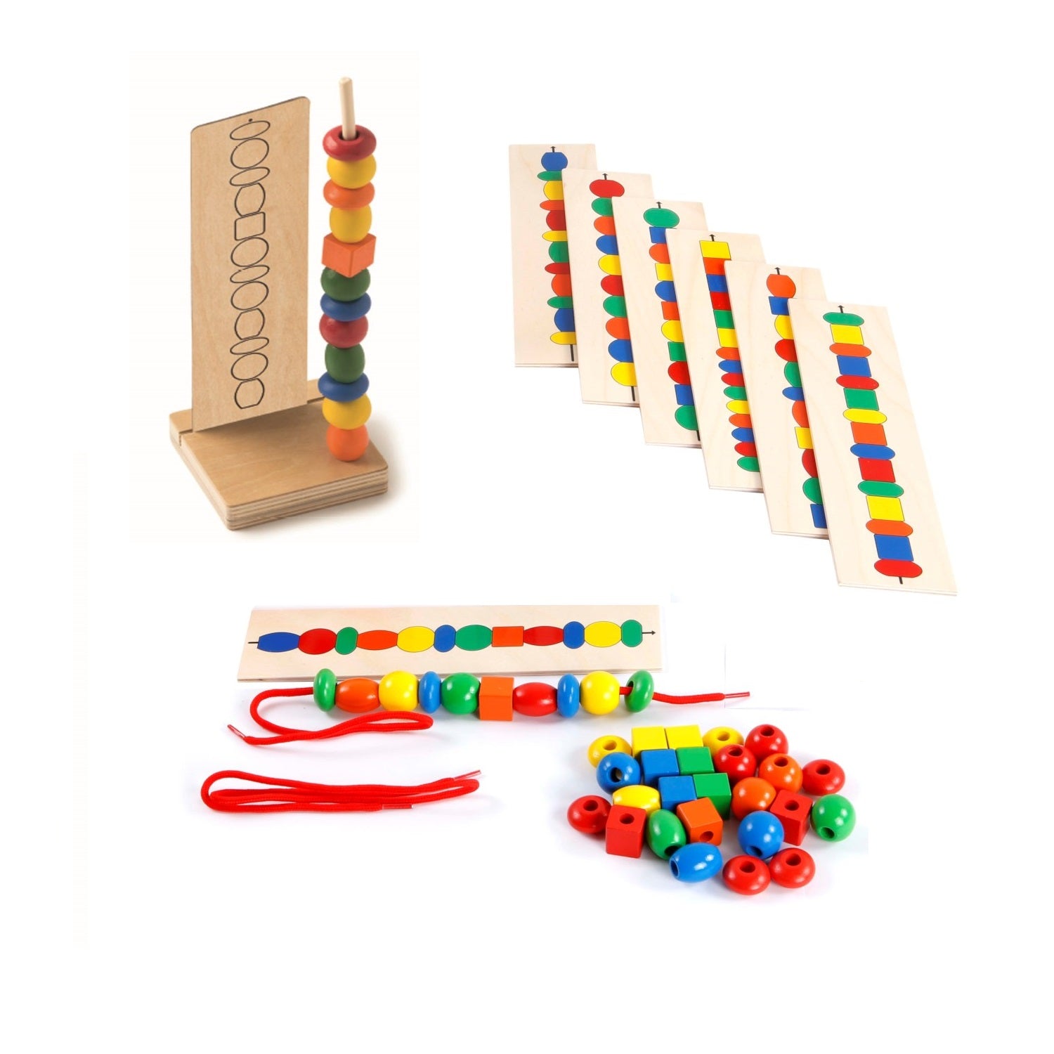 Learn about shapes, colours, order and patterns. Follow the patterns as shown on the assignment cards to fill the standard or thread. Choose own colours for the black and white patterns.