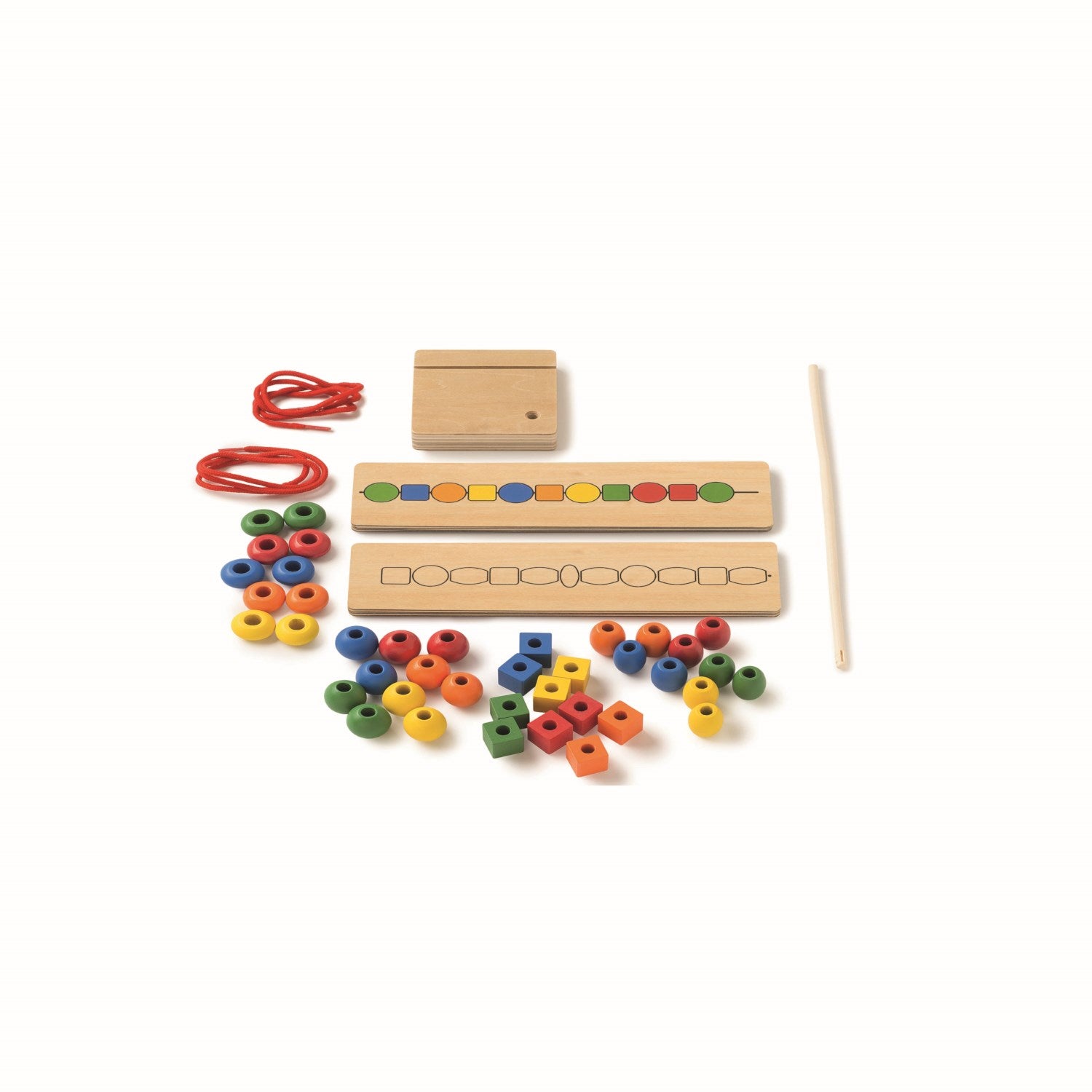 - 40 wooden beads in 5 colours and 4 shapes
