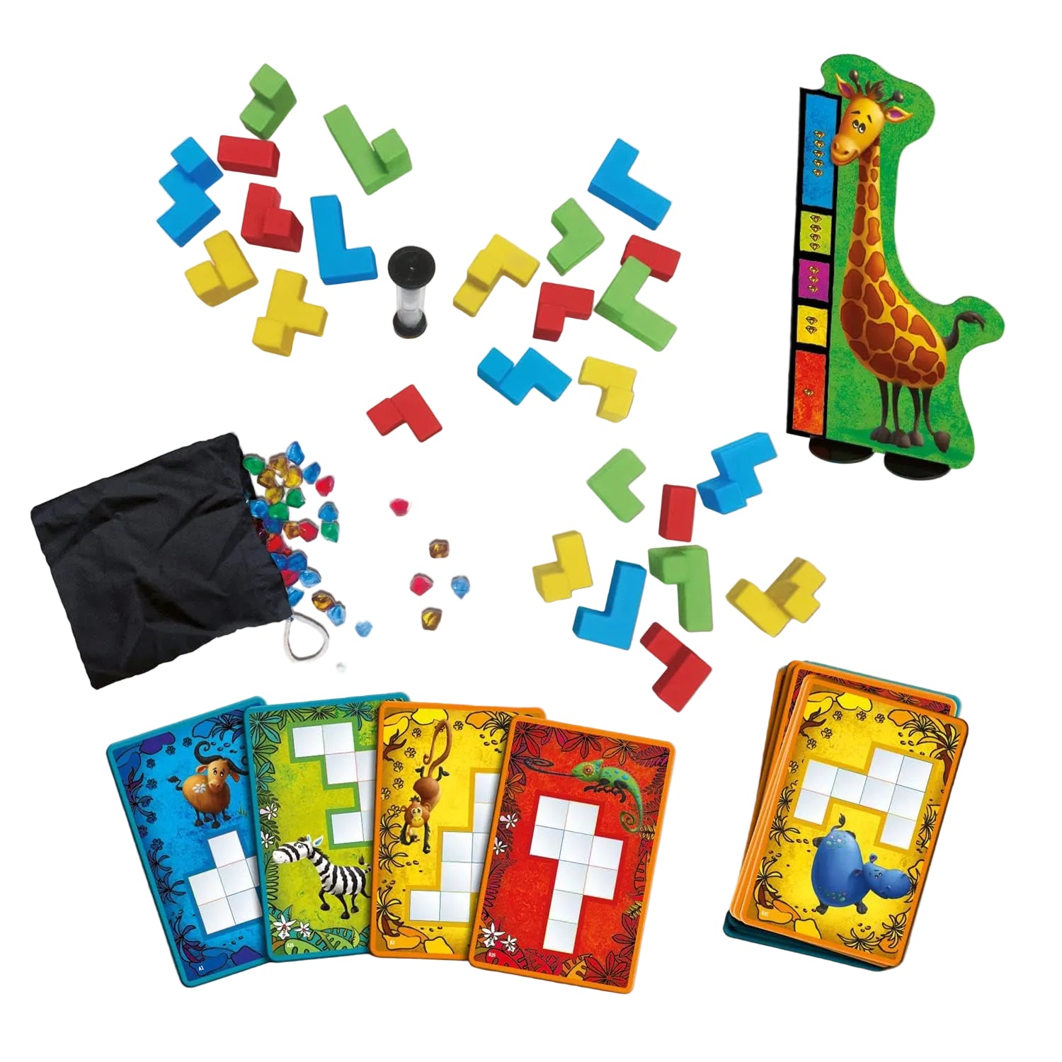 內容物: 50 張雙面題目卡(共 100 題)、32 塊彩色立體積木、1 隻長頸鹿測量工具、多顆彩色寶石、1 個沙漏。