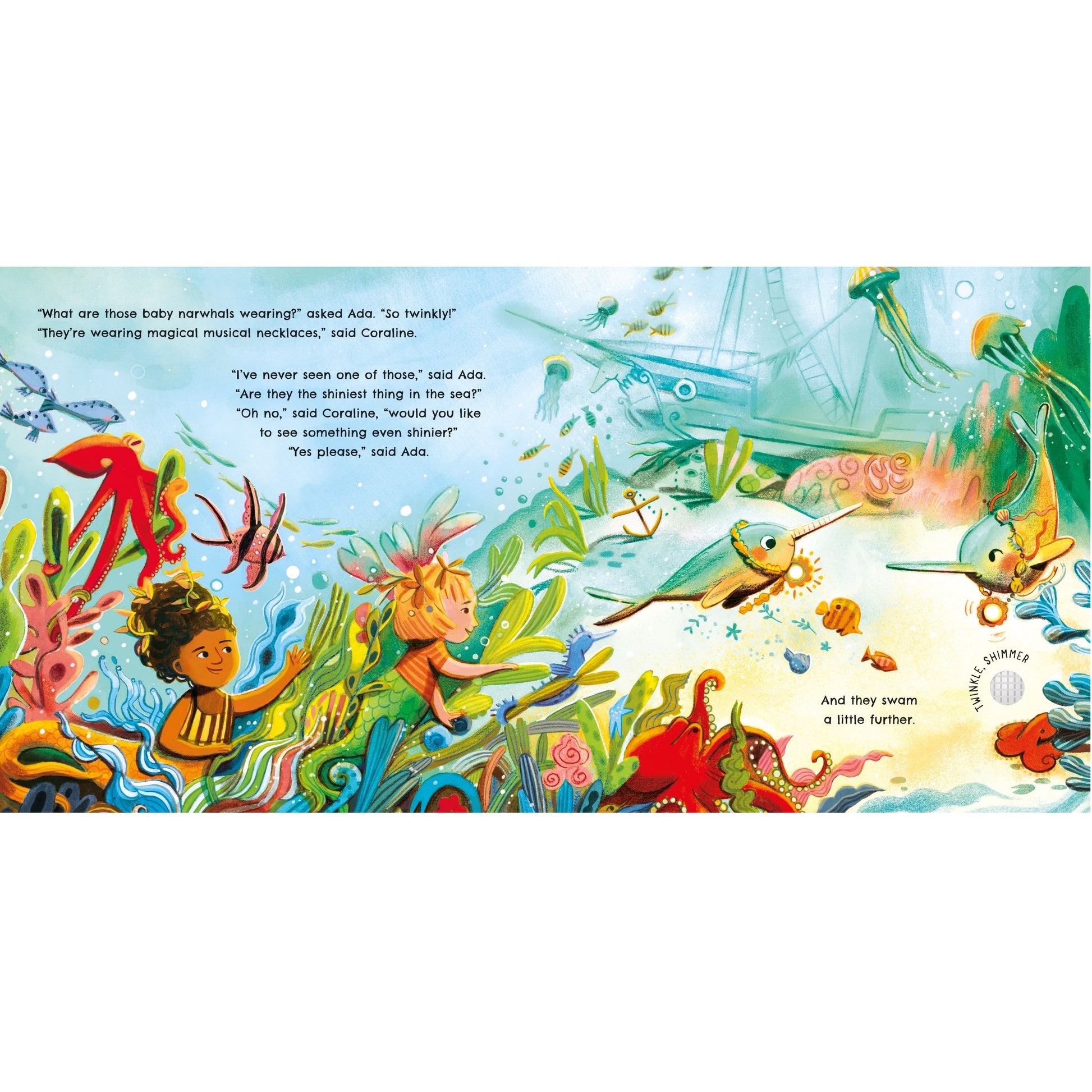 There are twinkly lights and sparkly sounds to discover when you press each button inside this enchanting novelty book. Join Ada the mermaid as she goes on a journey to discover the twinkliest thing in the ocean, meeting narwhals, sea dragons, and shining pearls along the way.
