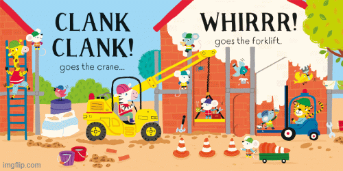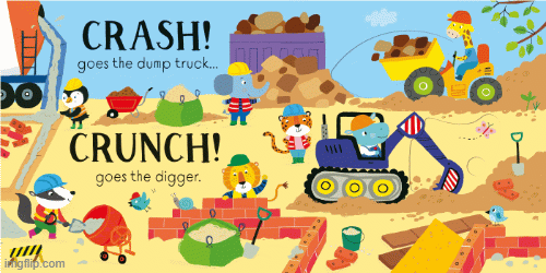 Move the sliders back and forth in this unique sound book to hear the building site come to life. From noisy diggers and clanking cranes to forklift trucks and road-rollers, the charmingly illustrated scenes are full of busy vehicles. Each slider has two different sounds on it—move it one way to see and hear one vehicle, then move it back again to hear a different one.