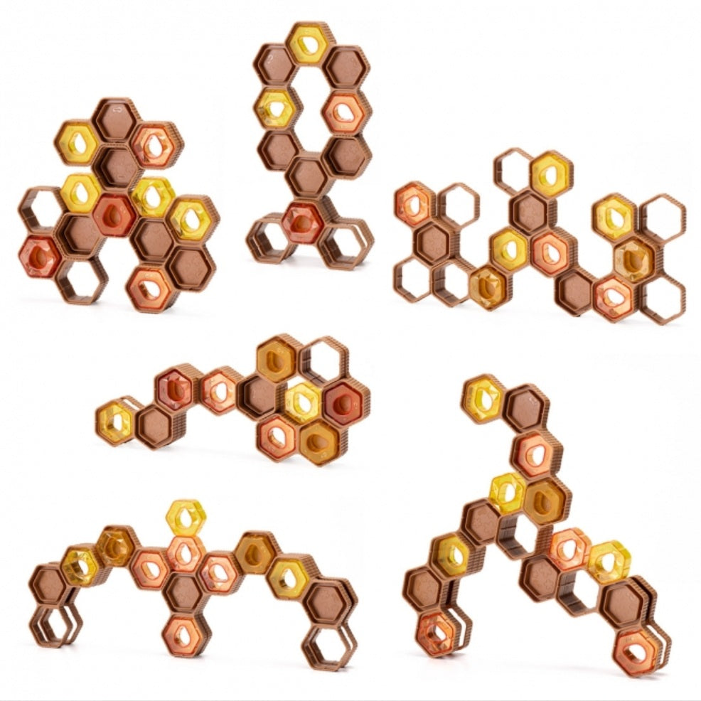 搭建立體的蜂巢造型,放置蜂蜜積木時更考驗工具操作的精準度和力道控制。