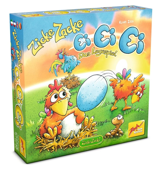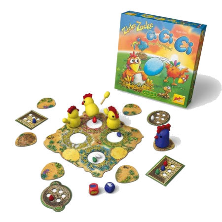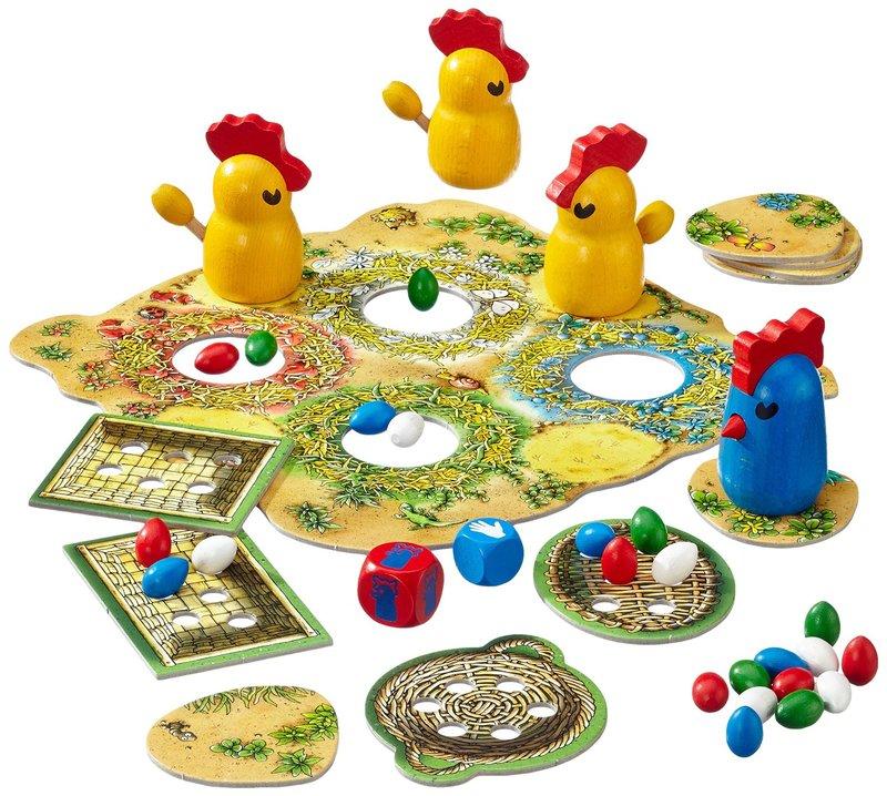 Hercules the cockerel must crow before the hens can lay eggs. The track is laid out and each hen gets an egg. You roll: For a hen you place on hen onto a free hen spot. For the cockerel you move Hercules by one tile. If he reaches the dung heap, you crow and all in turn take one hen and let it lay an egg into a free nest. When the freshly laid egg has the color of the nest, you may take all eggs in the nest. If not, the egg stays in the nest. Whoever collects six eggs first, wins. In the version “Schnapp den Hahn!” you use both dice and for „hand + cockerel“ all grab for Hercules - if you catch him you may let a hen lay an egg.